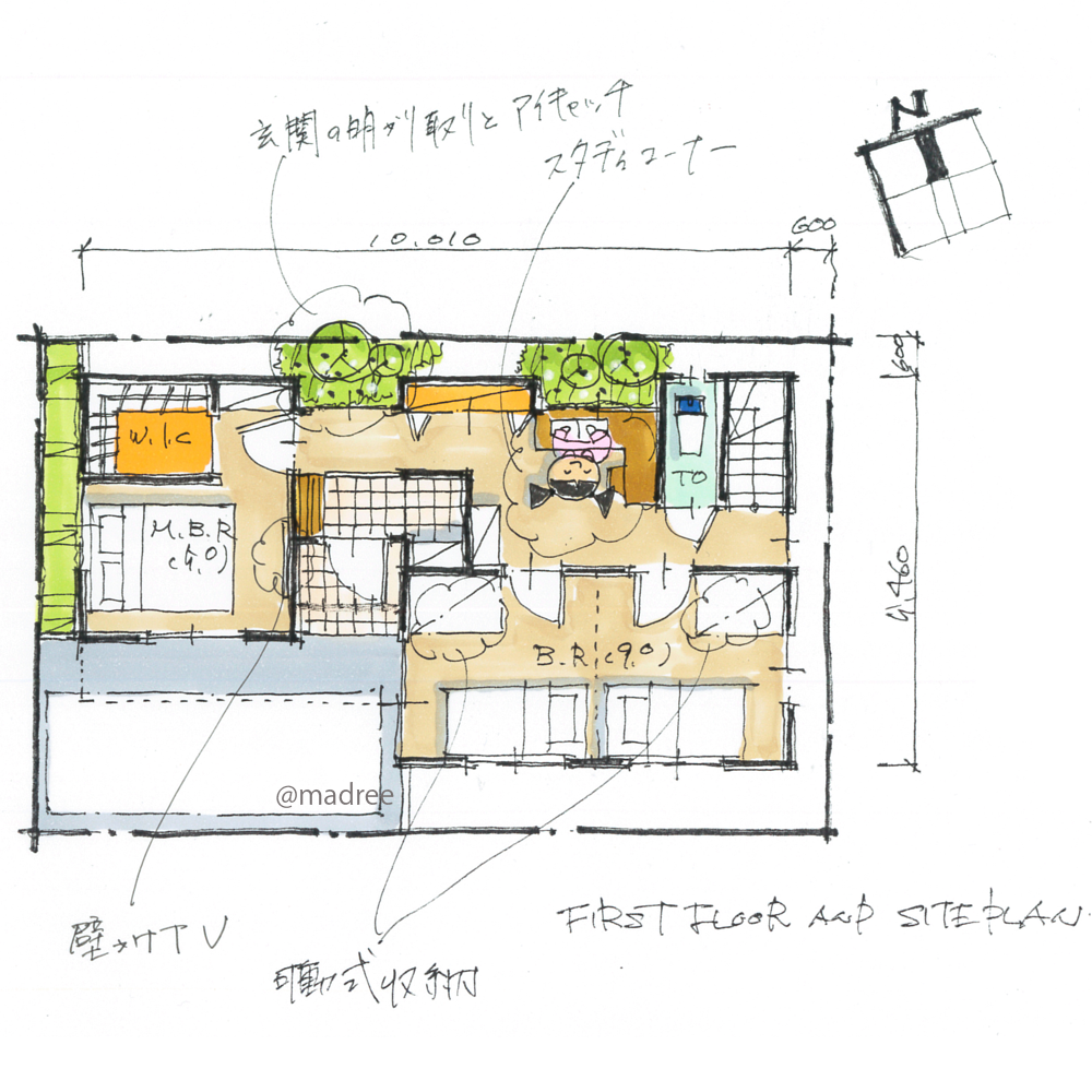 ・1階に居室を配置する場合に難しいのは、採光確保(建築基準法上の)ですが、子ども部屋を最初は1室にしておいて、後々分けれるようにすることにして、主寝室、子ども部屋の二部屋を道路からの採光が取れるようにしました。