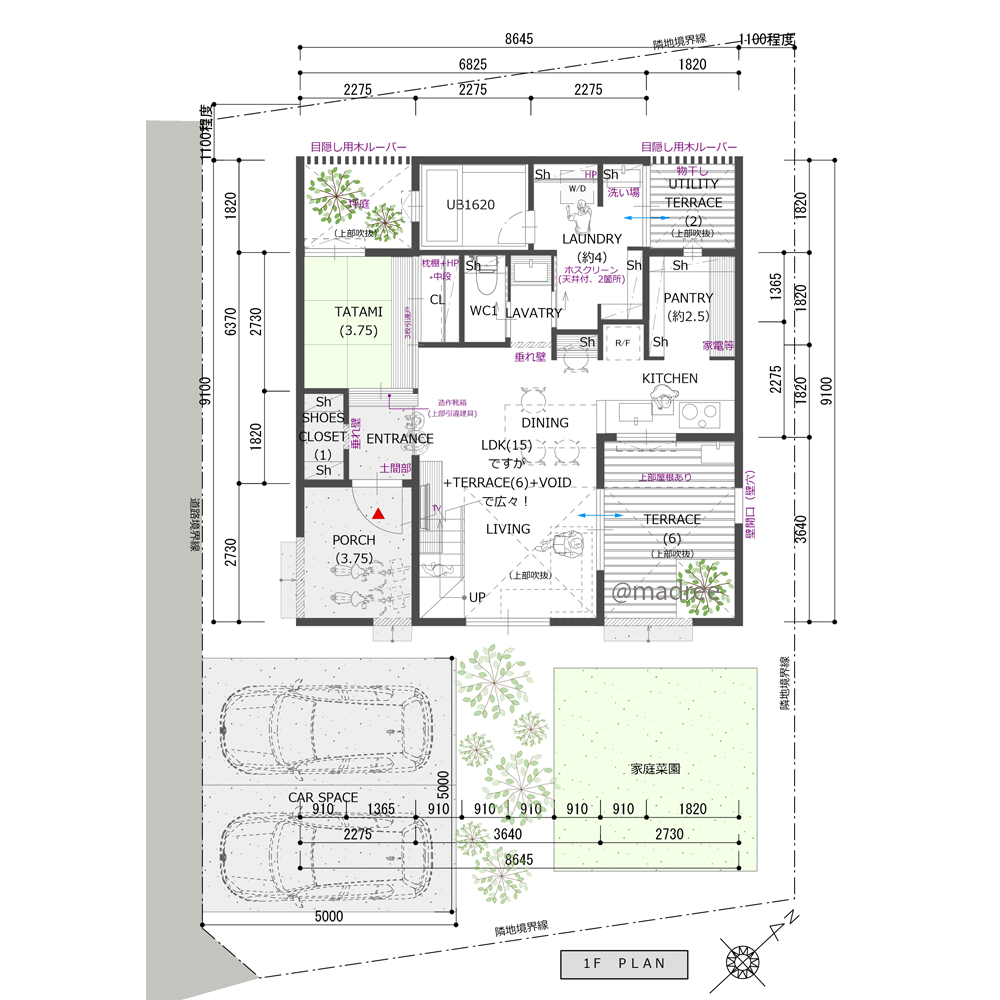 ・屋根付きの駐車スペースは、住宅施工後に別途カーポートの設置を想定しています。