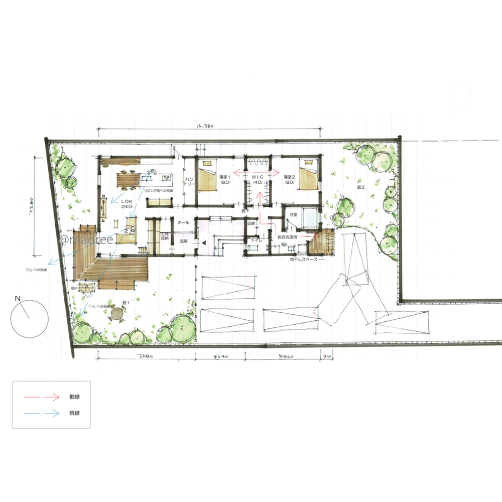 [32坪 3LDK] 庭の暖炉で釣った魚を炭火焼、非日常を味わう川近くの平屋別荘の間取り