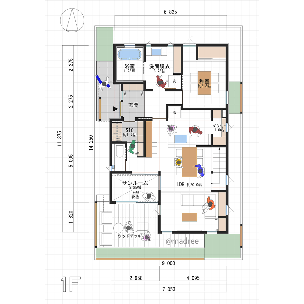 全国の建築家から間取りが集まるmadree(マドリー)で集まった40坪、5LDKの間取りです。外とつながるLDKやアウトドアリビングが特徴の注文住宅の間取りです。
