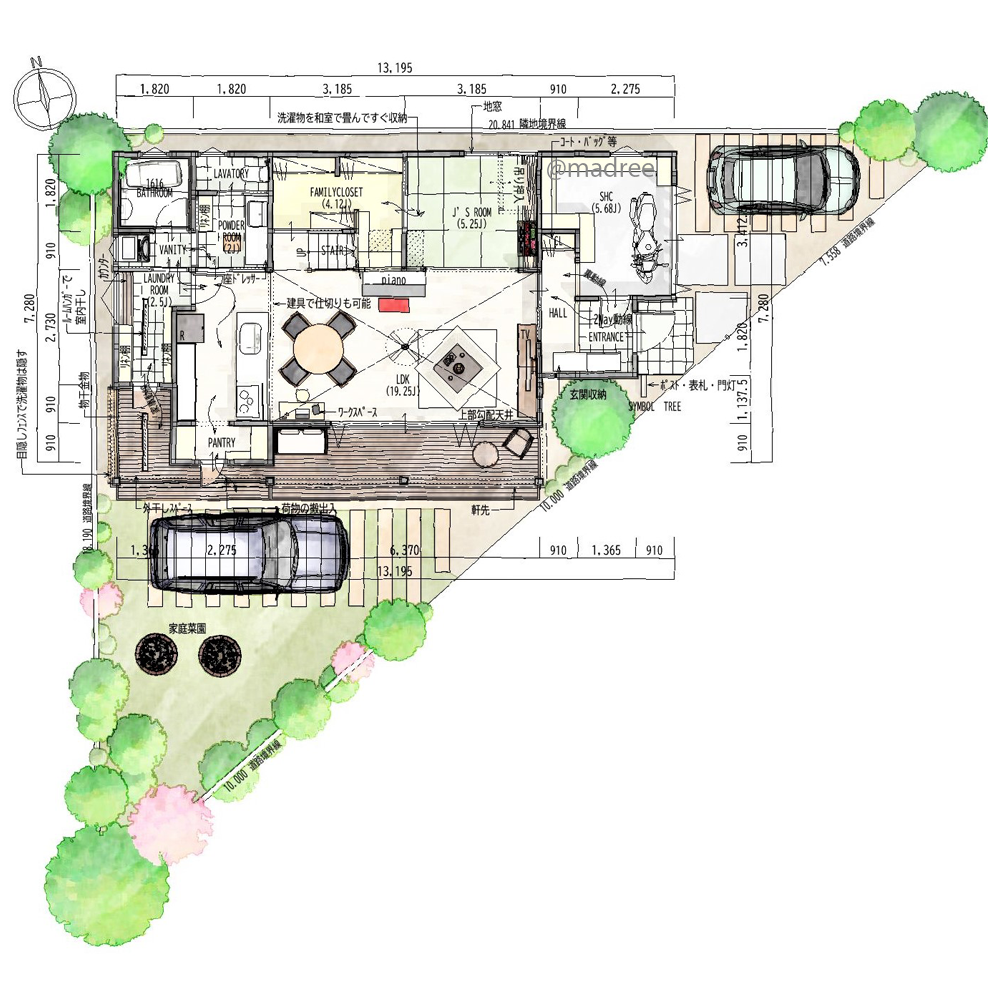 ・敷地が三角ですが、出来る限り東西方向に広く建物をつくり、明るく開放的なLDKを確保しながら、スムーズな家事動線を考えてみました。