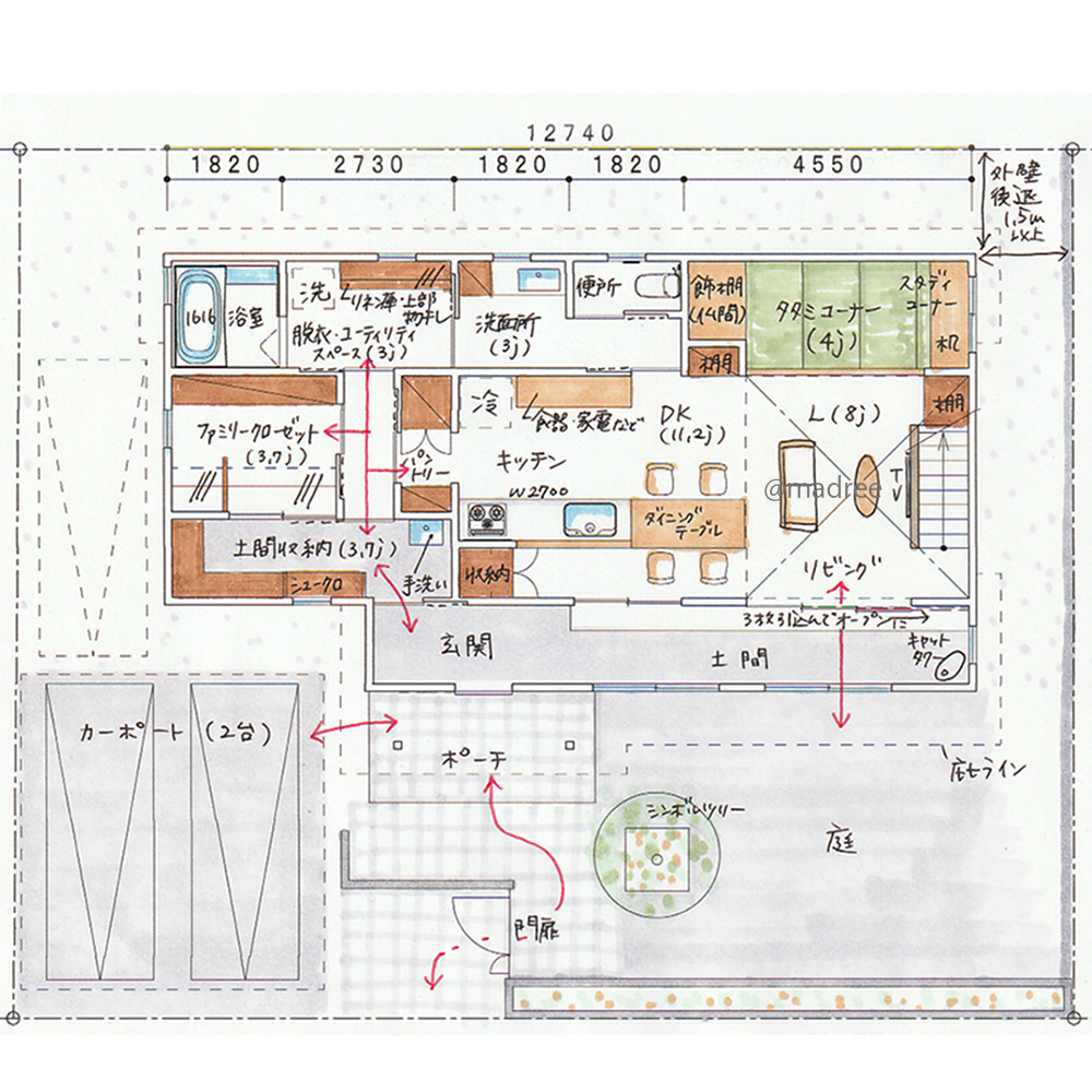 全国の建築家から間取りが集まるmadree(マドリー)で集まった39坪、3LDKの間取りです。浴室1坪やリビング中心の動線が特徴の注文住宅の間取りです。