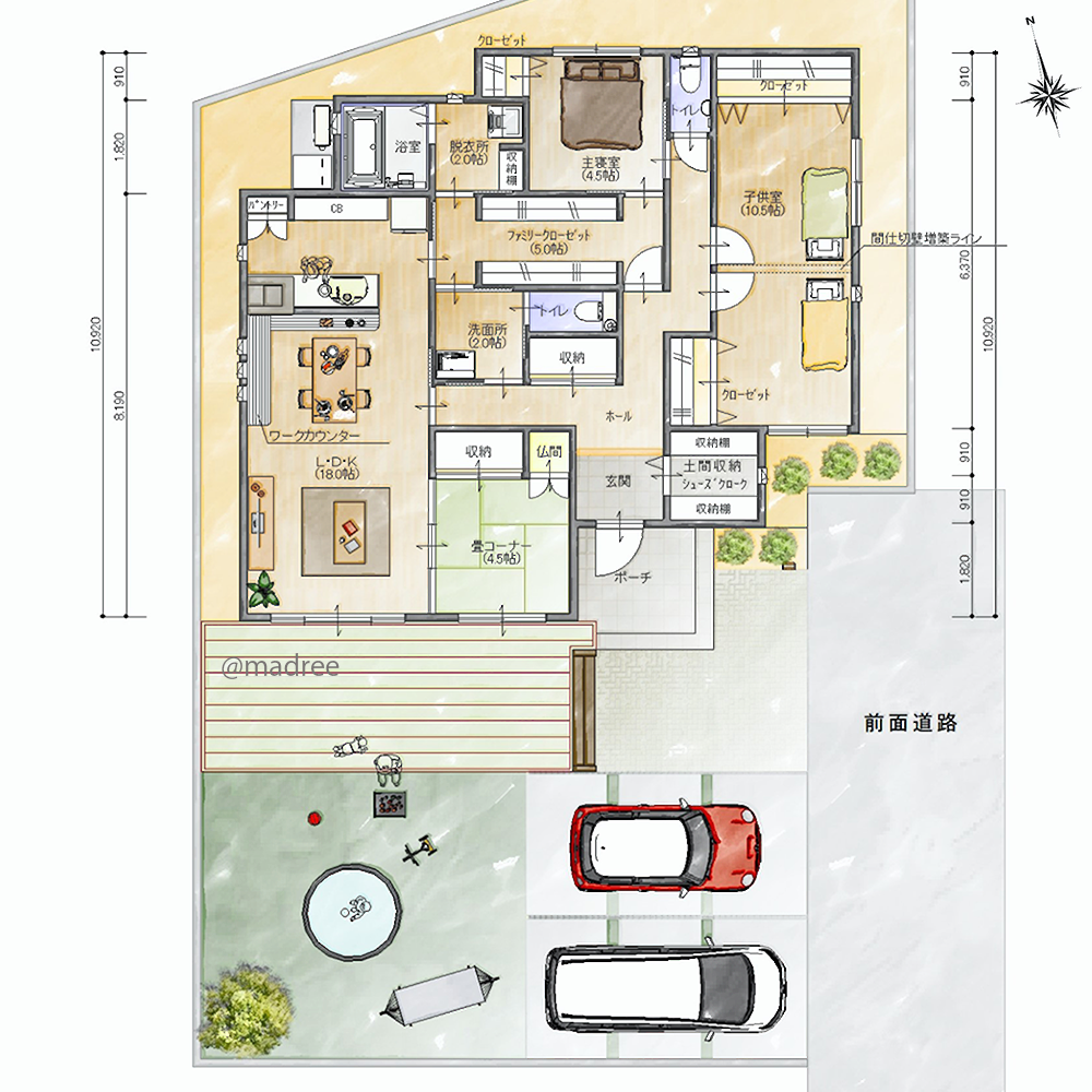 全国の建築家から間取りが集まるmadree(マドリー)で集まった32坪、4LDKの間取りです。浴室1坪や外とつながるLDKが特徴の注文住宅の間取りです。