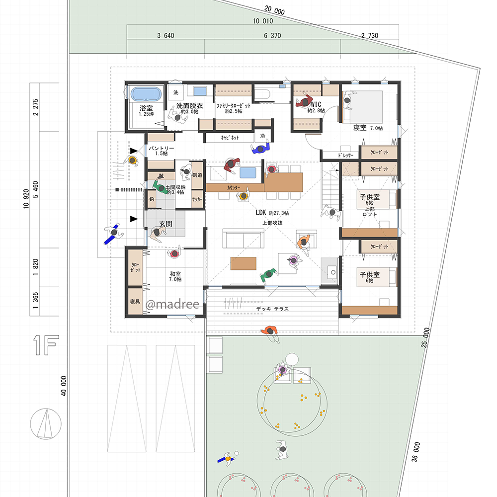 全国の建築家から間取りが集まるmadree(マドリー)で集まった38坪、4LDKの間取りです。浴室1.25坪や外とつながるLDKが特徴の注文住宅の間取りです。