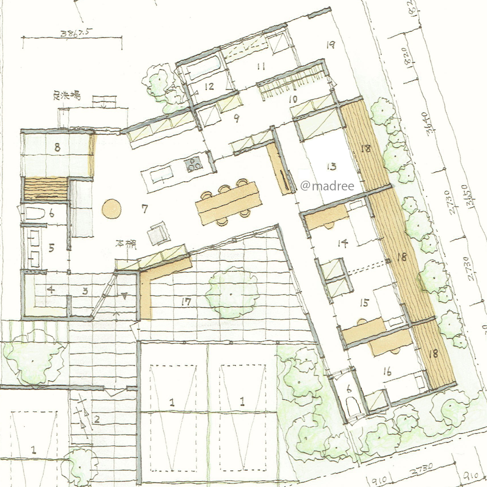 全国の建築家から間取りが集まるmadree(マドリー)で集まった35坪、3LDKの間取りです。浴室1坪や外とつながるLDKが特徴の注文住宅の間取りです。