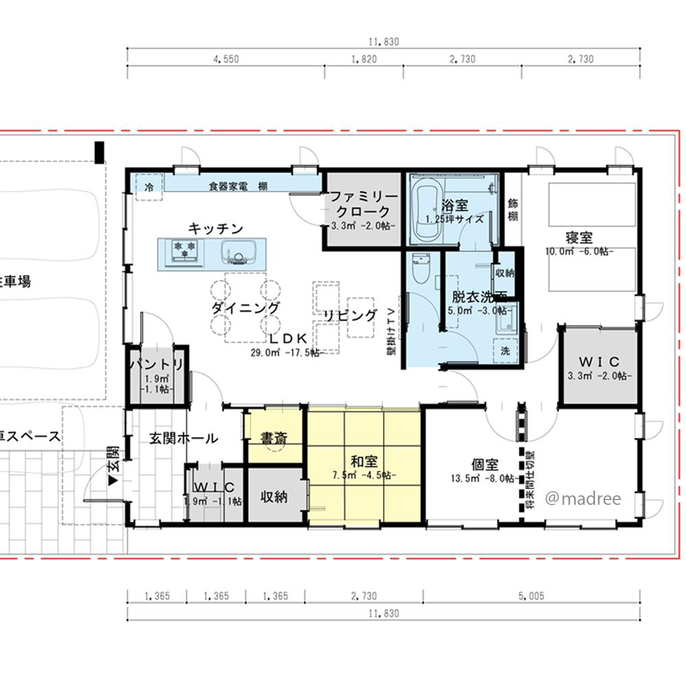 全国の建築家から間取りが集まるmadree(マドリー)で集まった27坪〜30坪、3LDKの間取りです。浴室1.25坪やリビング中心の動線が特徴の注文住宅の間取りです。