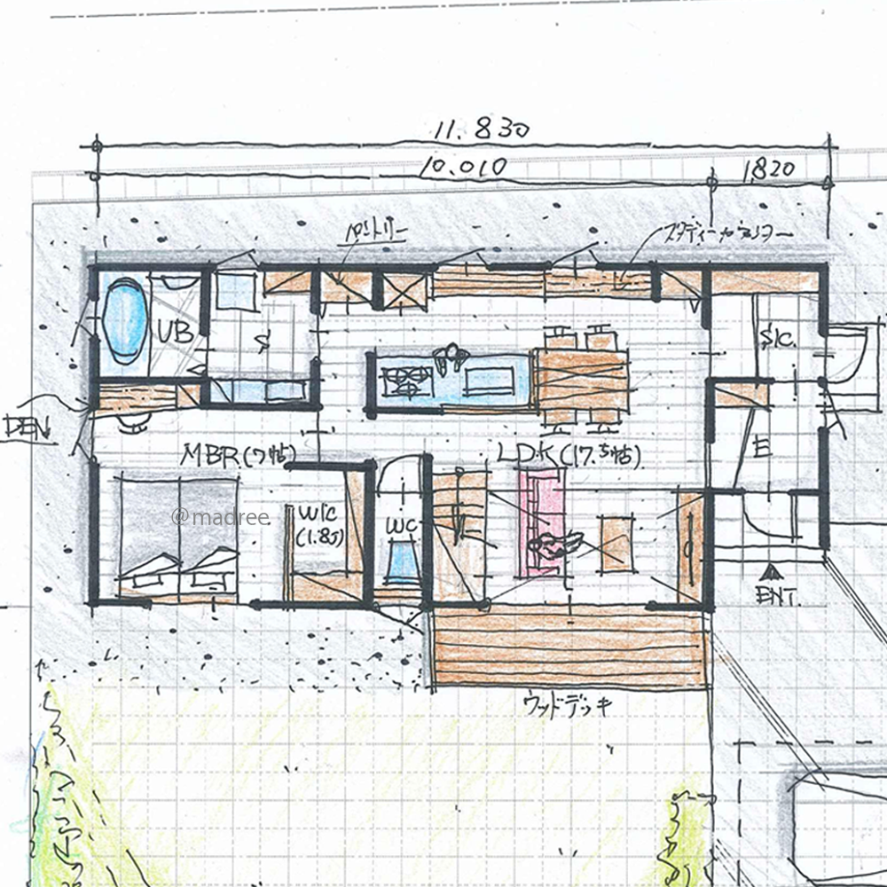 全国の建築家から間取りが集まるmadree(マドリー)で集まった27坪〜30坪、2LDKの間取りです。浴室1坪や外とつながるLDKが特徴の注文住宅の間取りです。