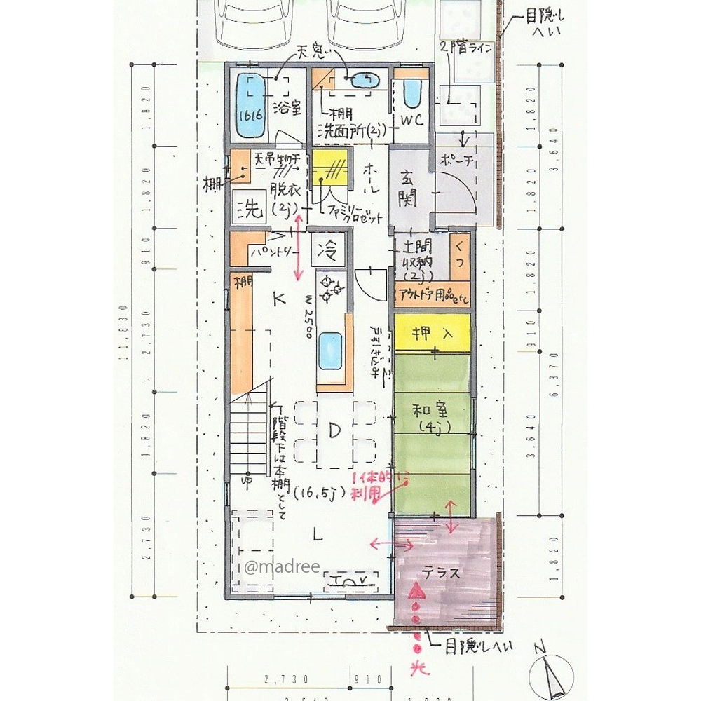 ・玄関の2畳の土間収納は、シュークローゼット以外にアウトドア用品や雨具の収納と想定しています。