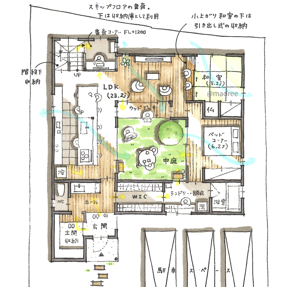 全国の建築家から間取りが集まるmadree(マドリー)で集まった36坪、3LDKの間取りです。浴室1坪や外とつながるLDKが特徴の注文住宅の間取りです。