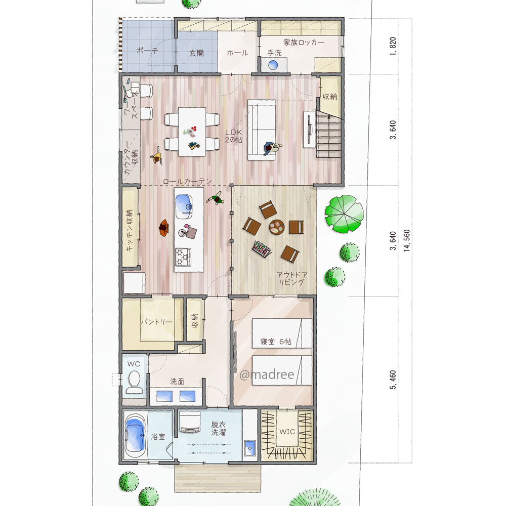 全国の建築家から間取りが集まるmadree(マドリー)で集まった34坪、3LDKの間取りです。浴室1坪や外とつながるLDKが特徴の注文住宅の間取りです。
