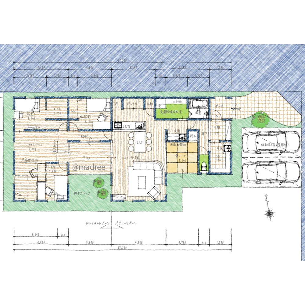 全国の建築家から間取りが集まるmadree(マドリー)で集まった36坪、3LDKの間取りです。浴室1坪や外とつながるLDKが特徴の注文住宅の間取りです。
