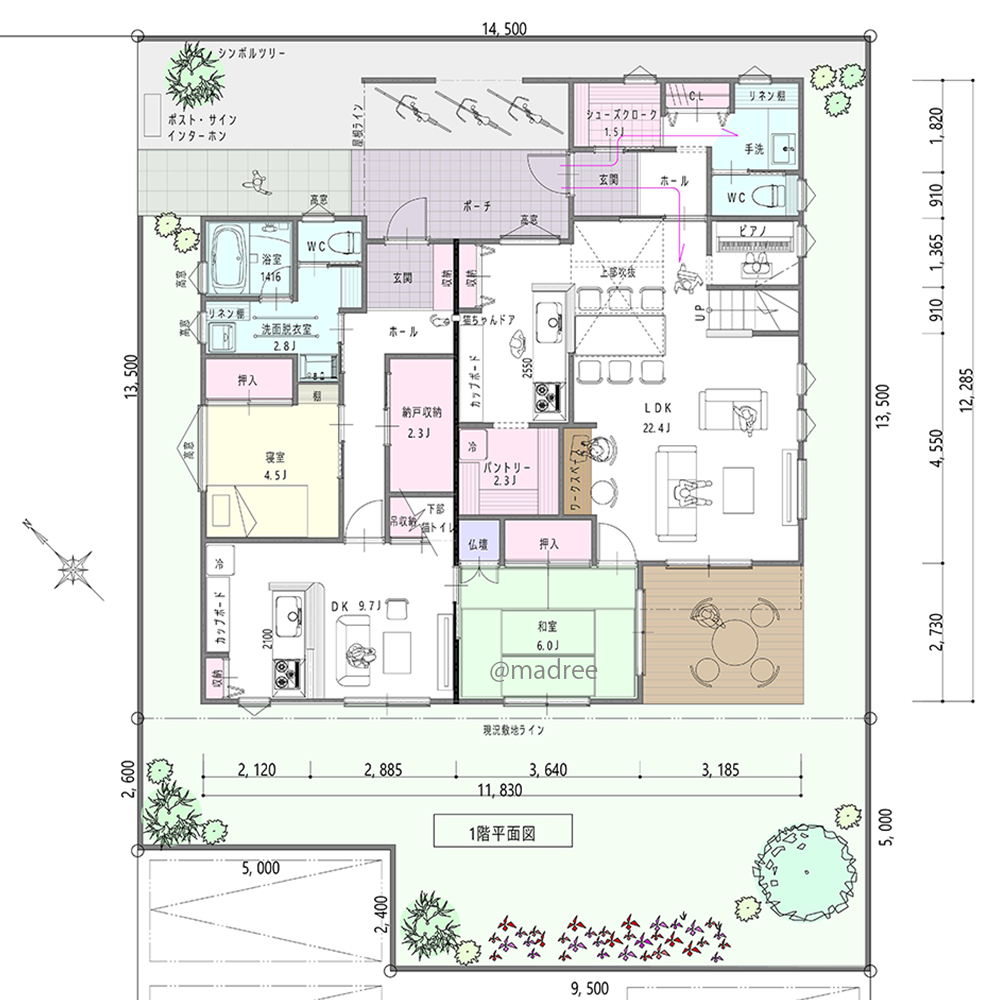 全国の建築家から間取りが集まるmadree(マドリー)で集まった58坪、5LDKの間取りです。浴室1坪や外とつながるLDKが特徴の注文住宅の間取りです。