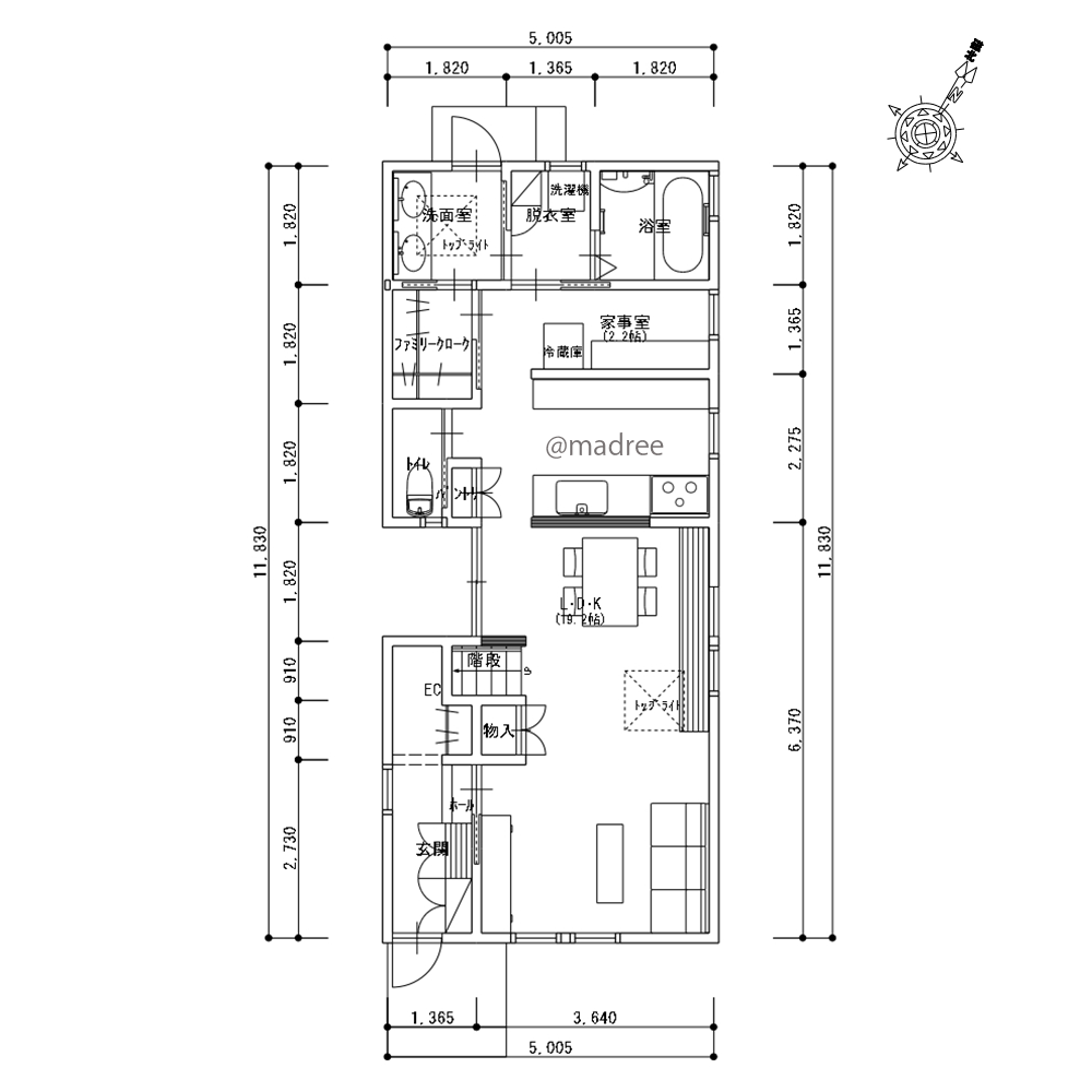 ・玄関からリビングに入ると、南北に長いLDKとなります。大きめのトップライトを設け、上部からの採光を確保しました。