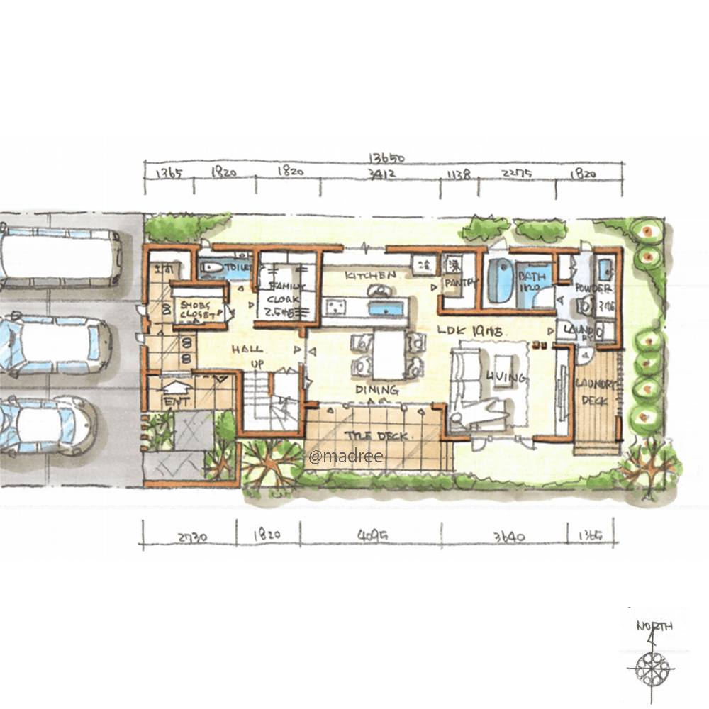 全国の建築家から間取りが集まるmadree(マドリー)で集まった37坪、4LDKの間取りです。外とつながるLDKやアウトドアリビングが特徴の注文住宅の間取りです。