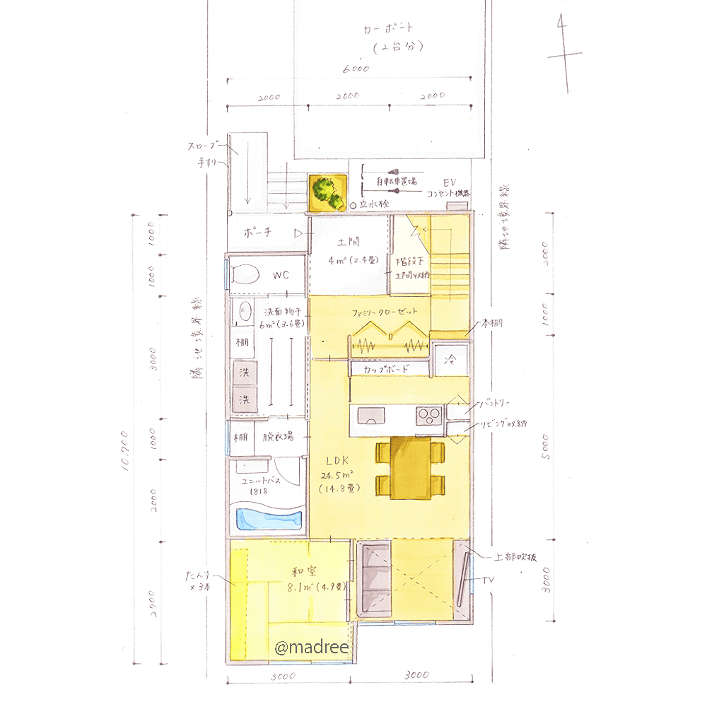 全国の建築家から間取りが集まるmadree(マドリー)で集まった32坪、5LDKの間取りです。リビング吹抜や子ども見守れるキッチンが特徴の注文住宅の間取りです。