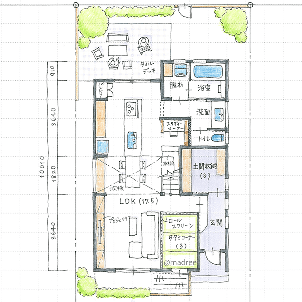 全国の建築家から間取りが集まるmadree(マドリー)で集まった32坪、2LDKの間取りです。外とつながるLDKやアウトドアリビングが特徴の注文住宅の間取りです。