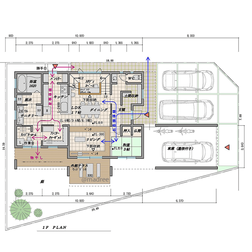 全国の建築家から間取りが集まるmadree(マドリー)で集まった36坪、5LDKの間取りです。外とつながるLDKやアウトドアリビングが特徴の注文住宅の間取りです。