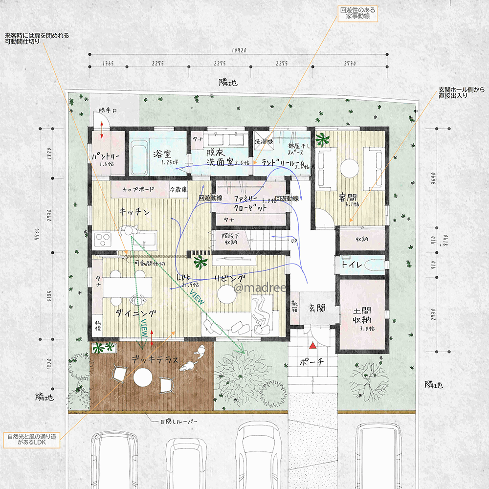 全国の建築家から間取りが集まるmadree(マドリー)で集まった47坪、4LDKの間取りです。外とつながるLDKやアウトドアリビングが特徴の注文住宅の間取りです。