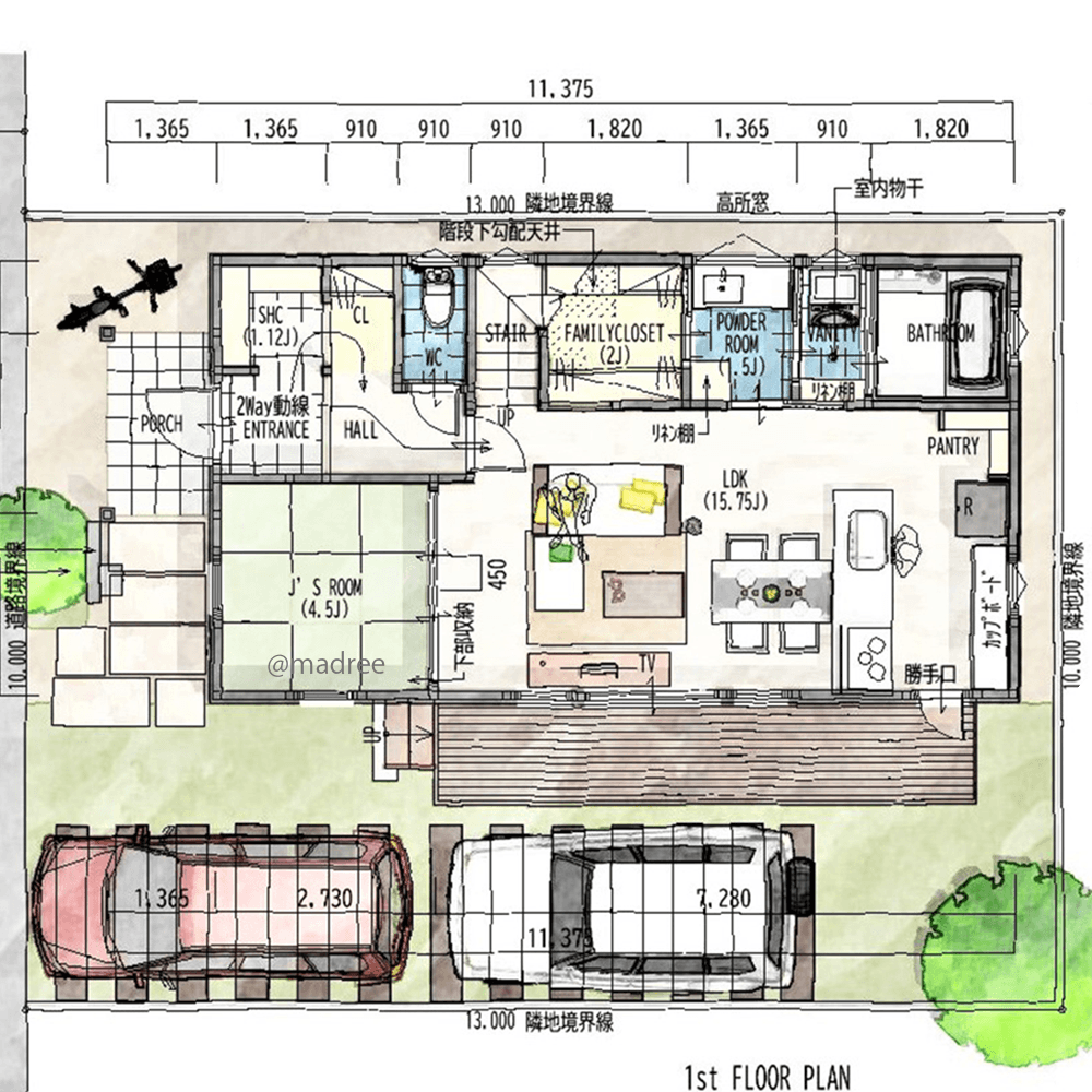全国の建築家から間取りが集まるmadree(マドリー)で集まった27坪〜30坪、3LDKの間取りです。外とつながるLDKやアウトドアリビングが特徴の注文住宅の間取りです。