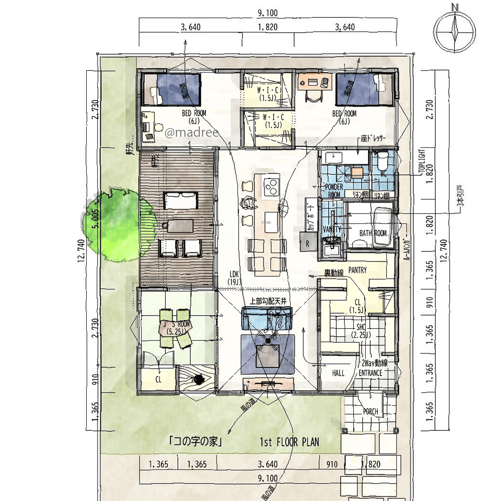 全国の建築家から間取りが集まるmadree(マドリー)で集まった27坪〜30坪、3LDKの間取りです。外とつながるLDKやアウトドアリビングが特徴の注文住宅の間取りです。