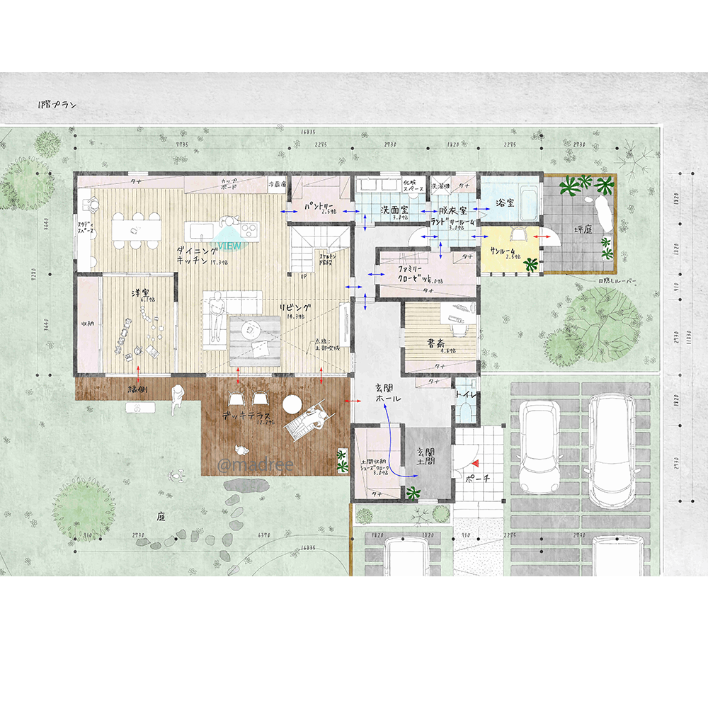 全国の建築家から間取りが集まるmadree(マドリー)で集まった50坪以上、5LDKの間取りです。外とつながるLDKやアウトドアリビングが特徴の注文住宅の間取りです。