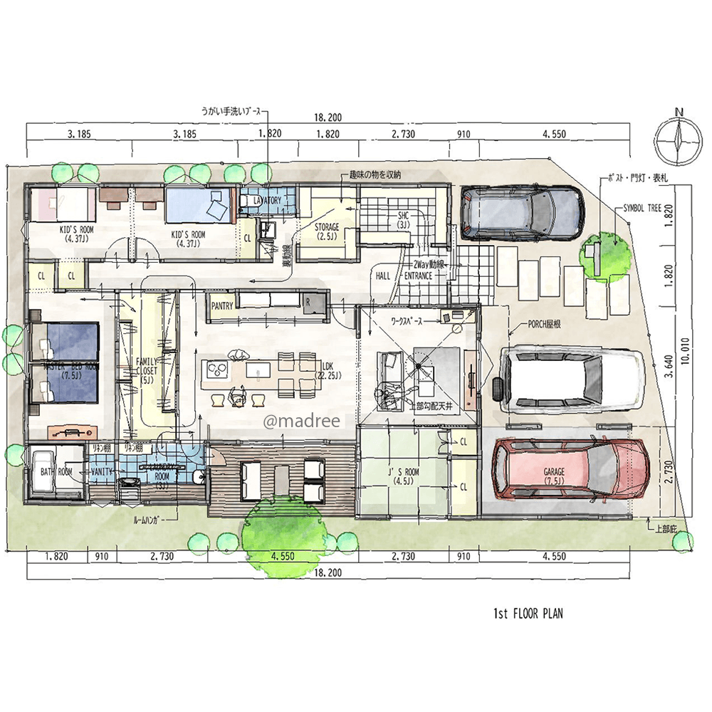 全国の建築家から間取りが集まるmadree(マドリー)で集まった36坪、3LDKの間取りです。外とつながるLDKやアウトドアリビングが特徴の注文住宅の間取りです。