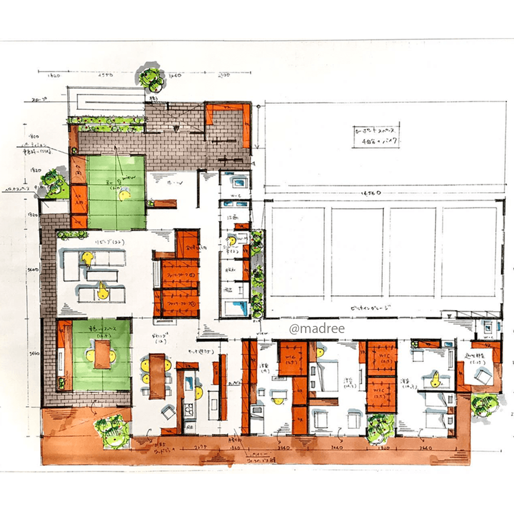 全国の建築家から間取りが集まるmadree(マドリー)で集まった101坪、5LDKの間取りです。外とつながるLDKやアウトドアリビングが特徴の注文住宅の間取りです。