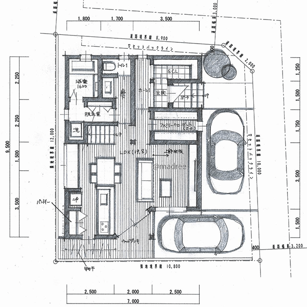 全国の建築家から間取りが集まるmadree(マドリー)で集まった32坪、4LDKの間取りです。外とつながるLDKやアウトドアリビングが特徴の注文住宅の間取りです。