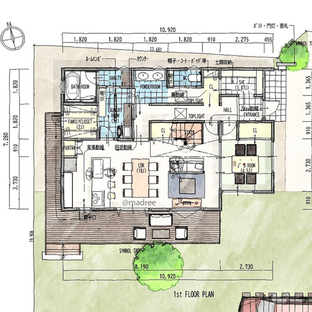 全国の建築家から間取りが集まるmadree(マドリー)で集まった40坪の間取りです。外とつながるLDKやアウトドアリビングが特徴の注文住宅の間取りです。