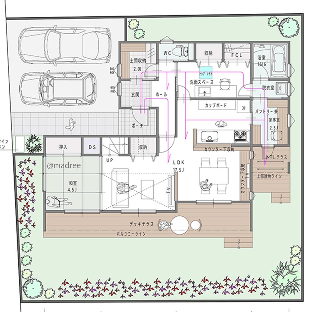 全国の建築家から間取りが集まるmadree(マドリー)で集まった37坪、5LDKの間取りです。外とつながるLDKやアウトドアリビングが特徴の注文住宅の間取りです。