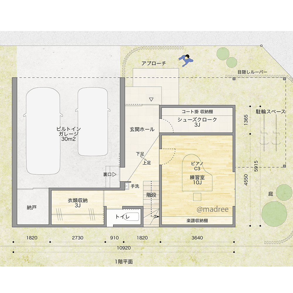 遮音には重量があるものが有効なので、南面に楽譜棚を設けることで南面への音を軽減することができます。練習室からも屋外の雰囲気が感じられるようにプライベートの庭を設けました。