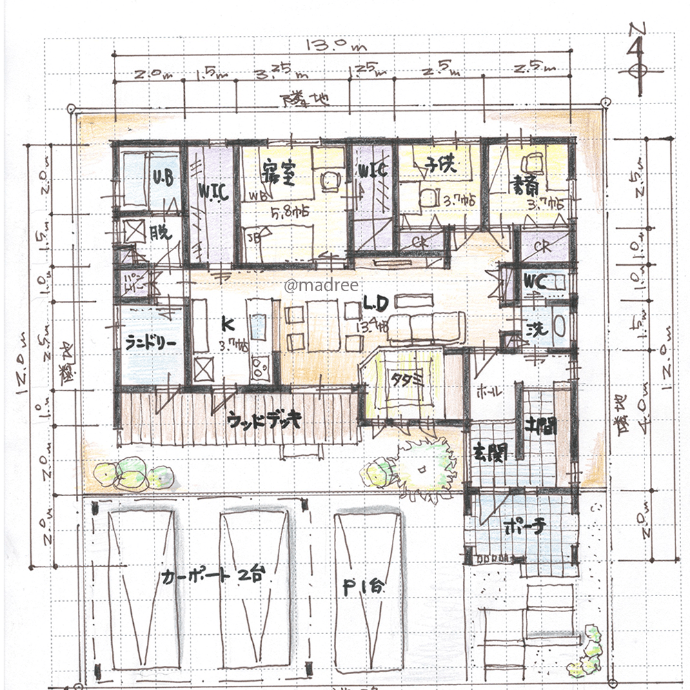 全国の建築家から間取りが集まるmadree(マドリー)で集まった33坪、3LDKの間取りです。外とつながるLDKや広く感じるLDKが特徴の注文住宅の間取りです。