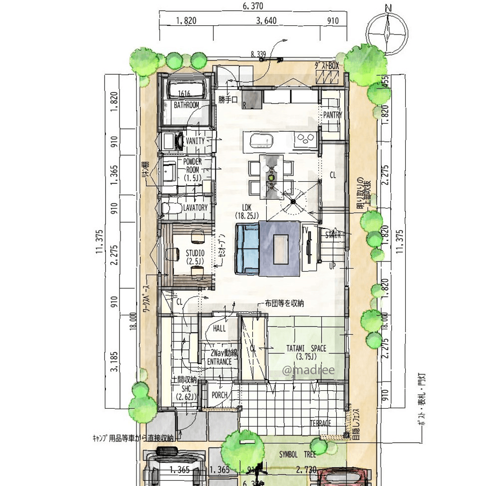 全国の建築家から間取りが集まるmadree(マドリー)で集まった34坪、2LDKの間取りです。外とつながるLDKやアウトドアリビングが特徴の注文住宅の間取りです。