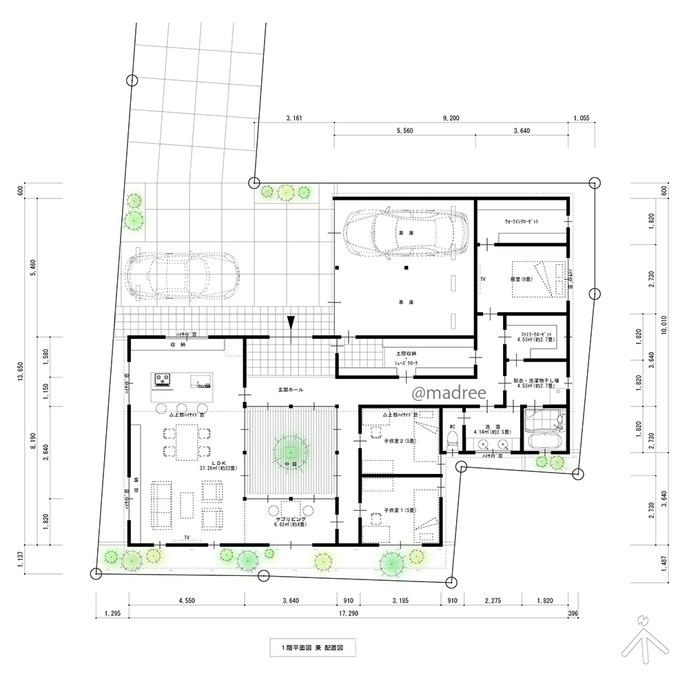 全国の建築家から間取りが集まるmadree(マドリー)で集まった49坪、3LDKの間取りです。外とつながるLDKや広く感じるLDKが特徴の注文住宅の間取りです。