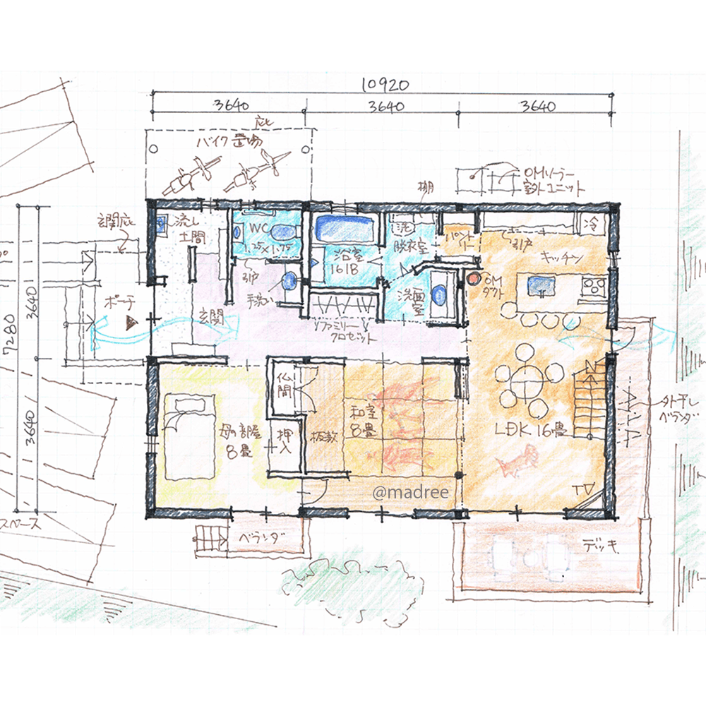 全国の建築家から間取りが集まるmadree(マドリー)で集まった38坪、5LDKの間取りです。外とつながるLDKやアウトドアリビングが特徴の注文住宅の間取りです。