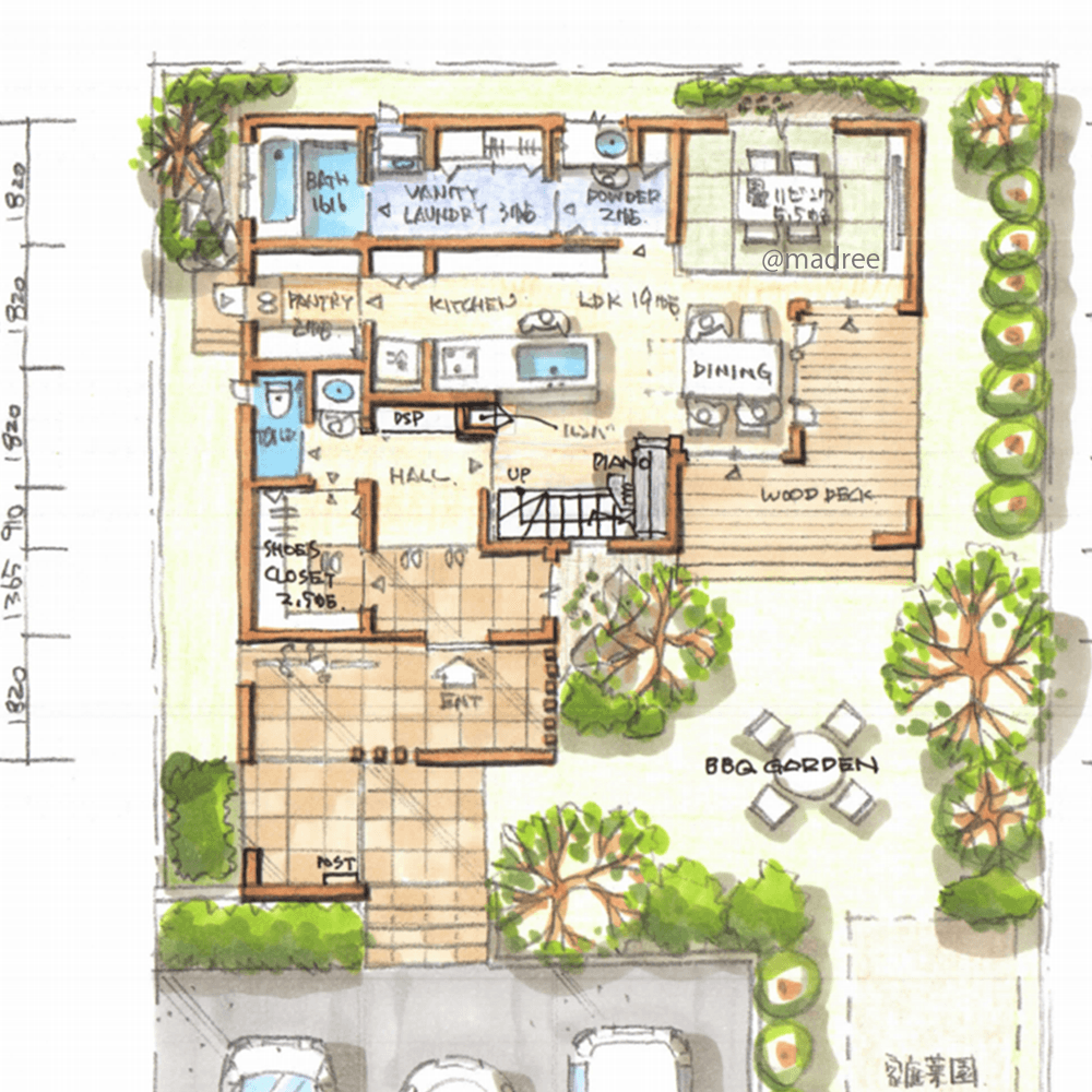全国の建築家から間取りが集まるmadree(マドリー)で集まった30坪、2LDKの間取りです。外とつながるLDKやアウトドアリビングが特徴の注文住宅の間取りです。