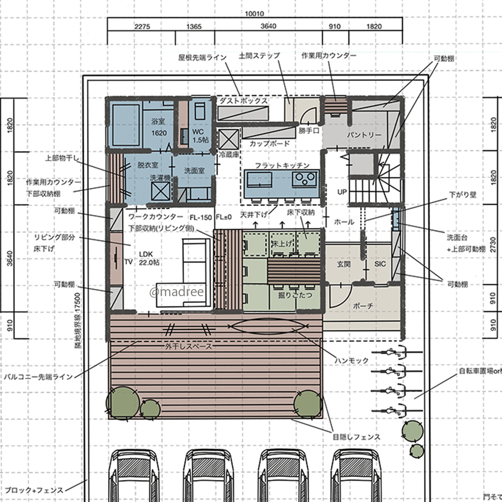全国の建築家から間取りが集まるmadree(マドリー)で集まった37坪、3LDKの間取りです。外とつながるLDKやアウトドアリビングが特徴の注文住宅の間取りです。