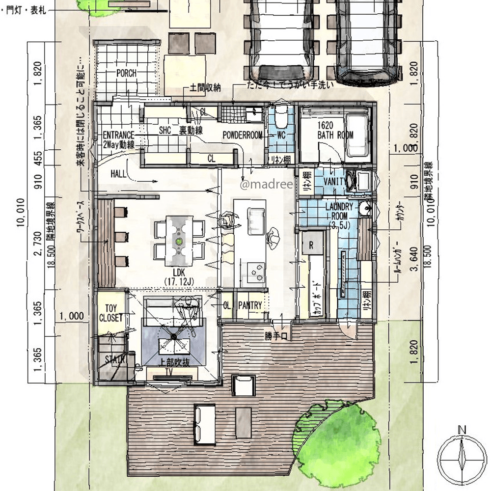 全国の建築家から間取りが集まるmadree(マドリー)で集まった34坪、3LDKの間取りです。外とつながるLDKやアウトドアリビングが特徴の注文住宅の間取りです。