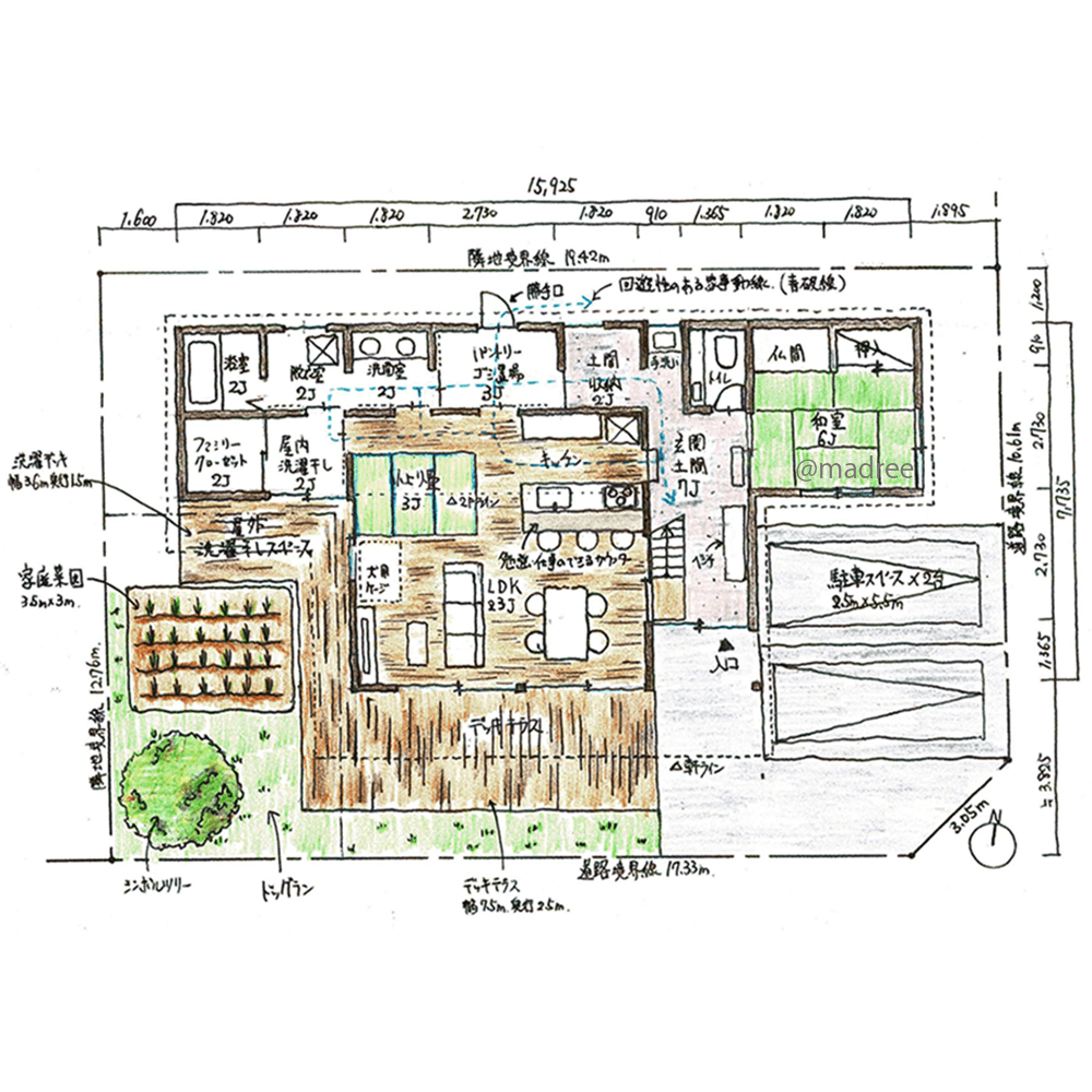 全国の建築家から間取りが集まるmadree(マドリー)で集まった39坪、3LDKの間取りです。外とつながるLDKやアウトドアリビングが特徴の注文住宅の間取りです。