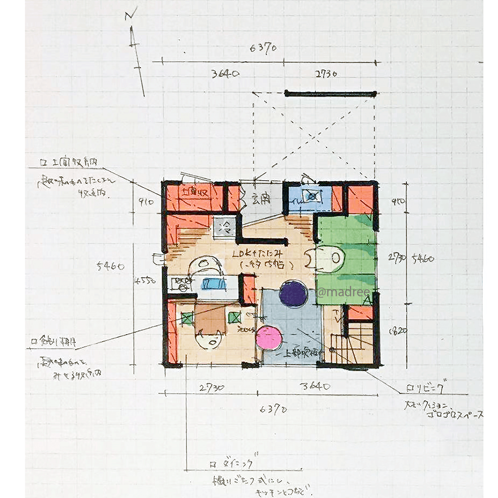 全国の建築家から間取りが集まるmadree(マドリー)で集まった22坪、2LDKの間取りです。リビング吹抜やリビング一体の畳が特徴の注文住宅の間取りです。
