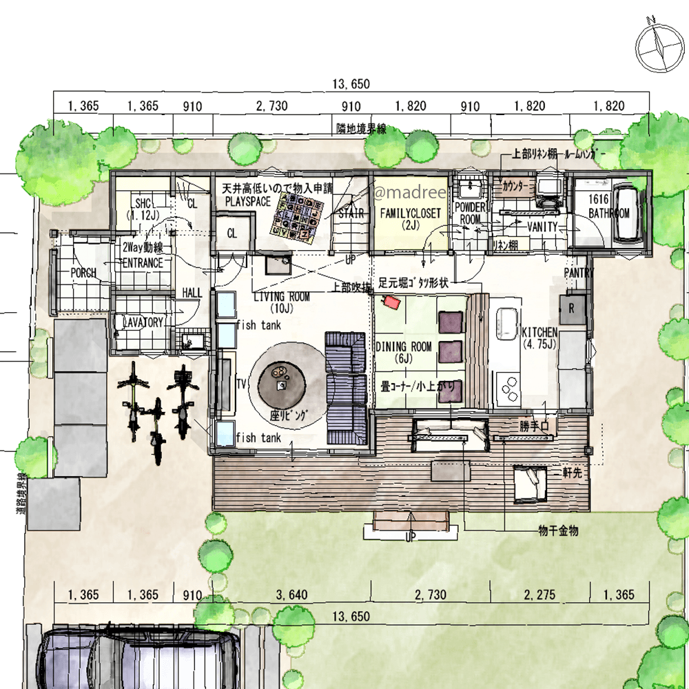 ・LDに上部吹抜のスキップフロアと小上がり畳ダイニングを設け、個性的な空間を演出しました。
