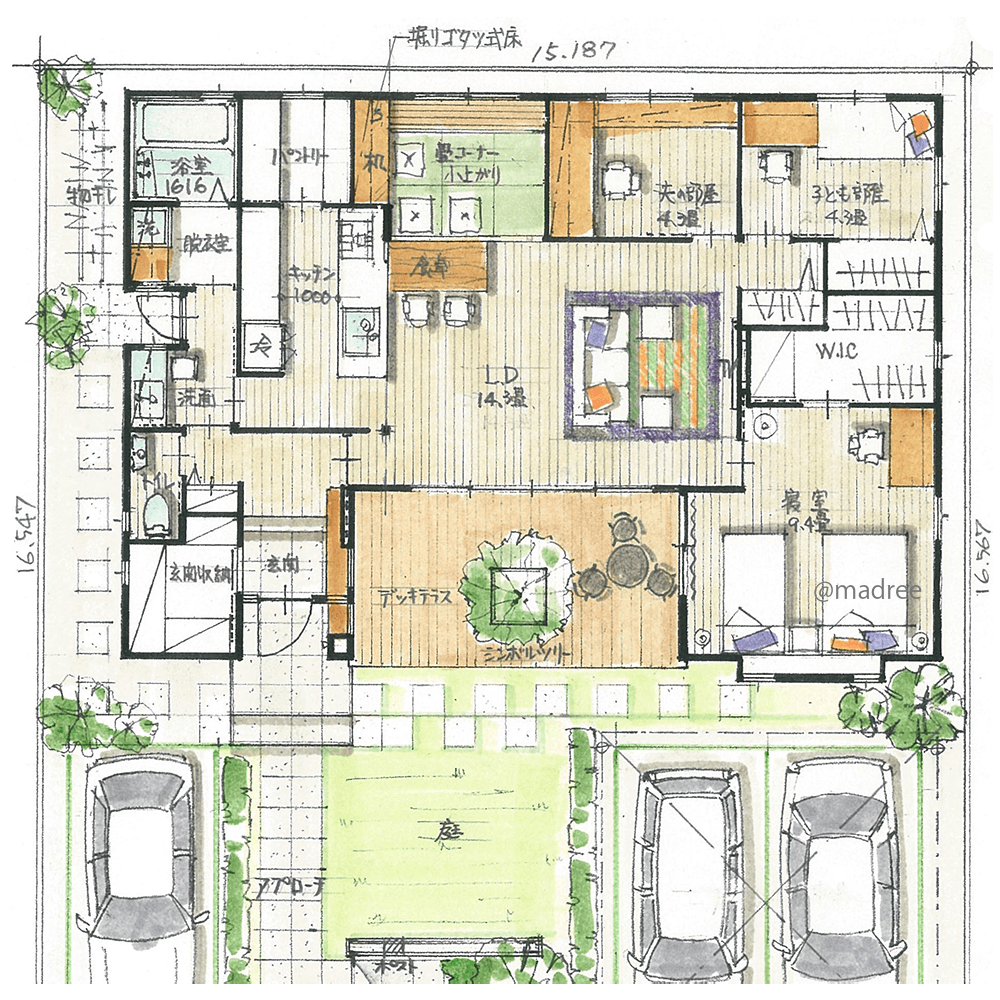全国の建築家から間取りが集まるmadree(マドリー)で集まった32坪、3LDKの間取りです。外とつながるLDKやアウトドアリビングが特徴の注文住宅の間取りです。