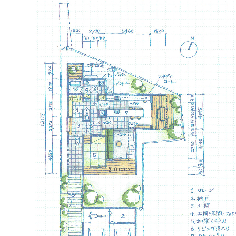 全国の建築家から間取りが集まるmadree(マドリー)で集まった39坪、5LDKの間取りです。外とつながるLDKやアウトドアリビングが特徴の注文住宅の間取りです。