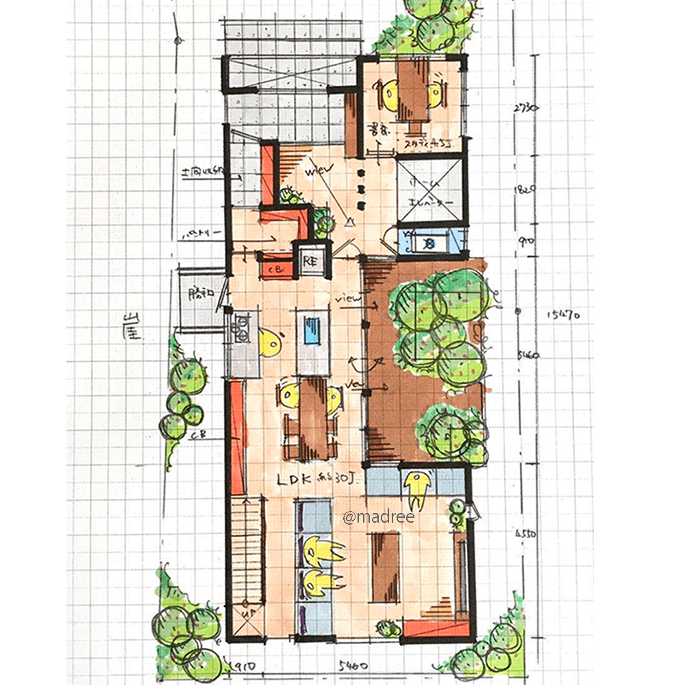 全国の建築家から間取りが集まるmadree(マドリー)で集まった50坪以上、5LDKの間取りです。外とつながるLDKやアウトドアリビングが特徴の注文住宅の間取りです。