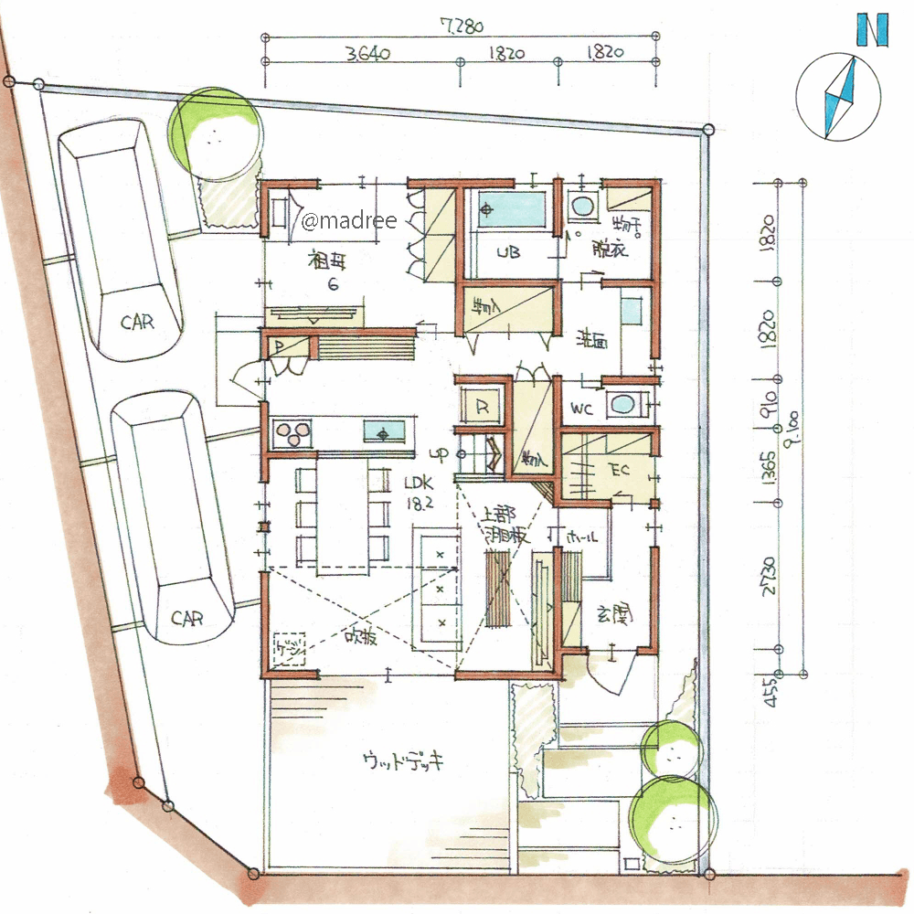 ・玄関を南東の角に配置し、ウッドデッキを横に感じながら入るイメージとしました。