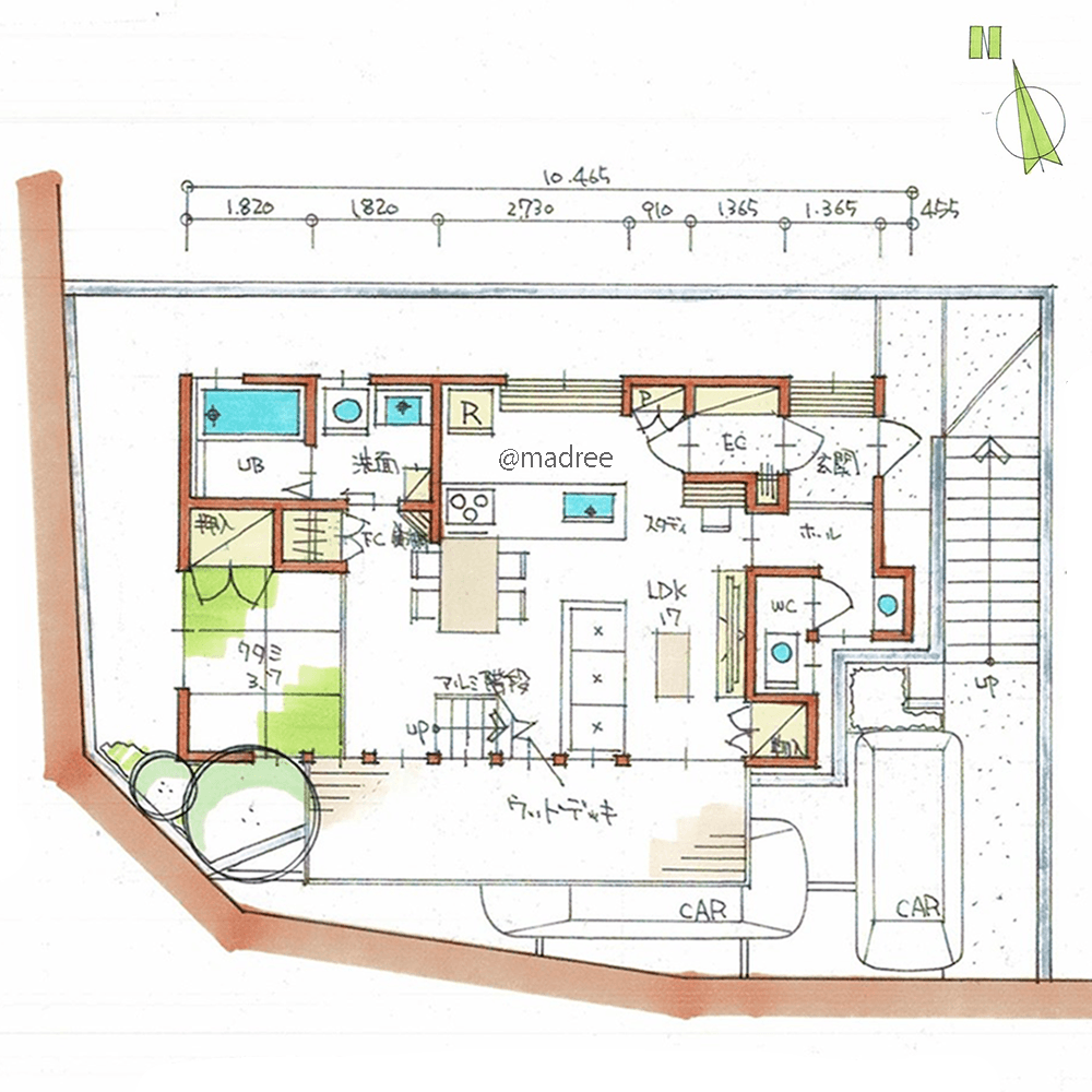 全国の建築家から間取りが集まるmadree(マドリー)で集まった27坪〜30坪、2LDKの間取りです。外とつながるLDKやアウトドアリビングが特徴の注文住宅の間取りです。