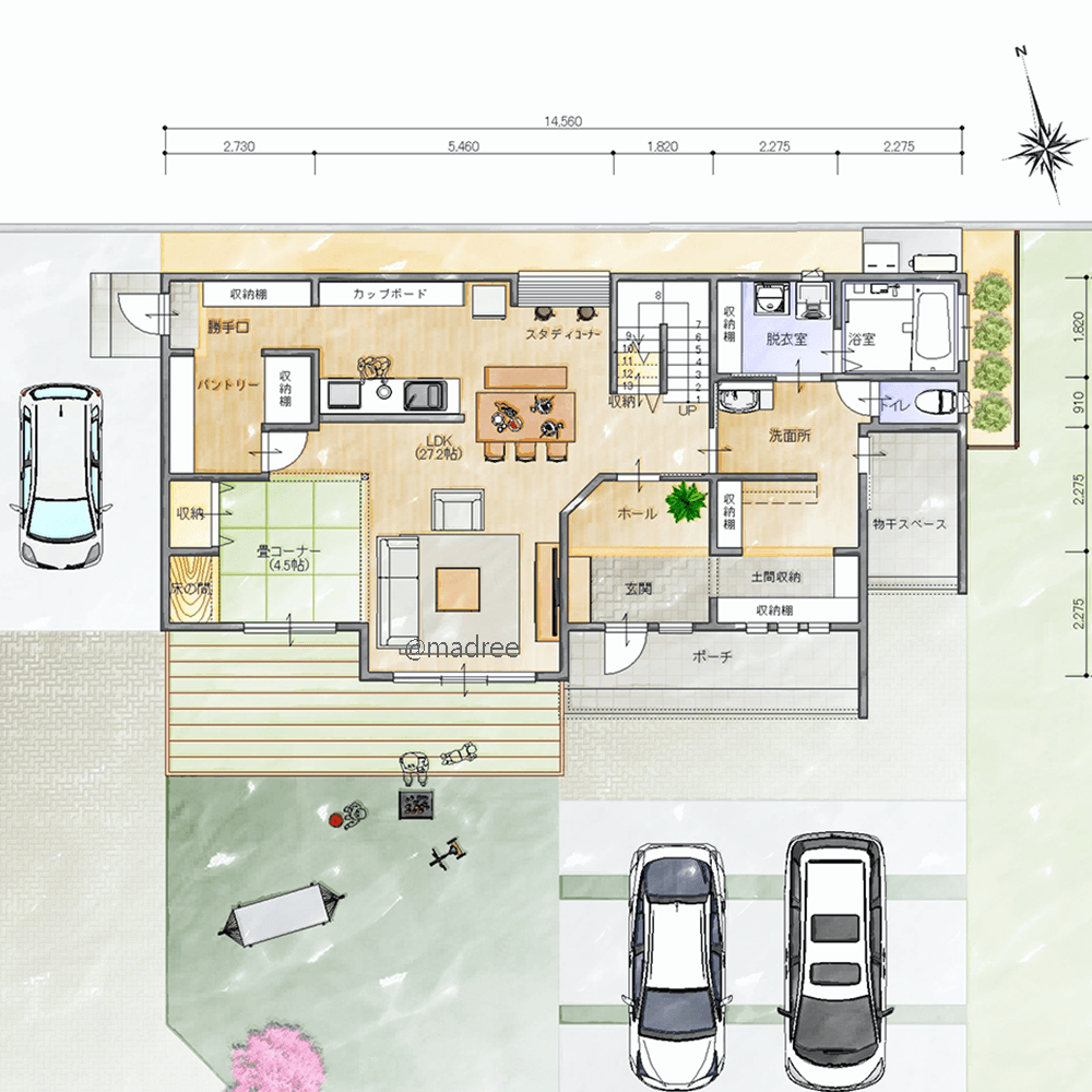・駐車スペースは、パントリー側と玄関側に分けて配置し、荷物の積み下ろしが楽々できるようにしました。