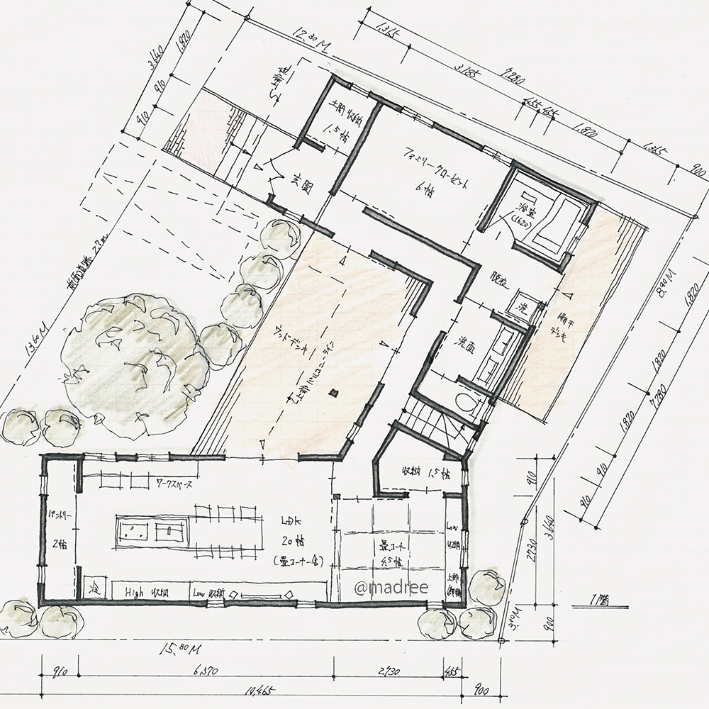 全国の建築家から間取りが集まるmadree(マドリー)で集まった36坪、3LDKの間取りです。外とつながるLDKやアウトドアリビングが特徴の注文住宅の間取りです。
