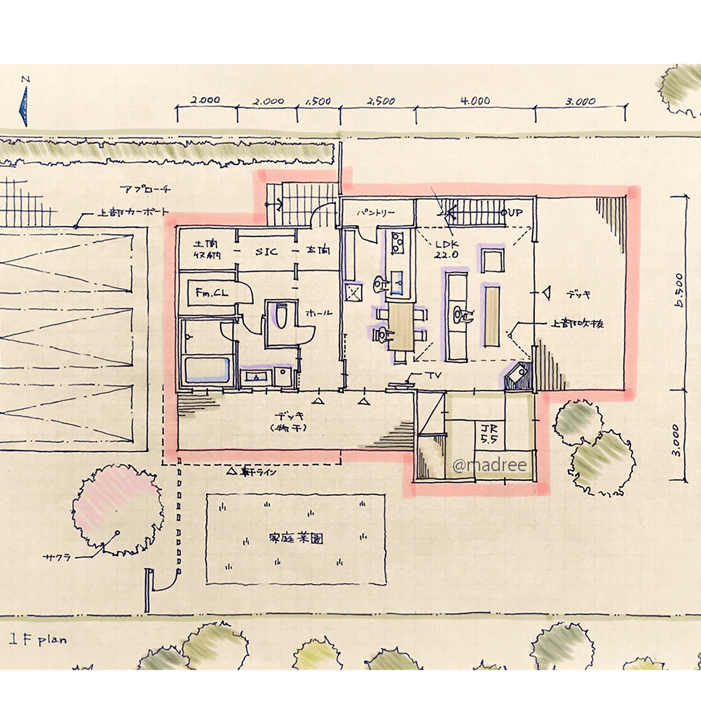 全国の建築家から間取りが集まるmadree(マドリー)で集まった40坪、3LDKの間取りです。外とつながるLDKやアウトドアリビングが特徴の注文住宅の間取りです。