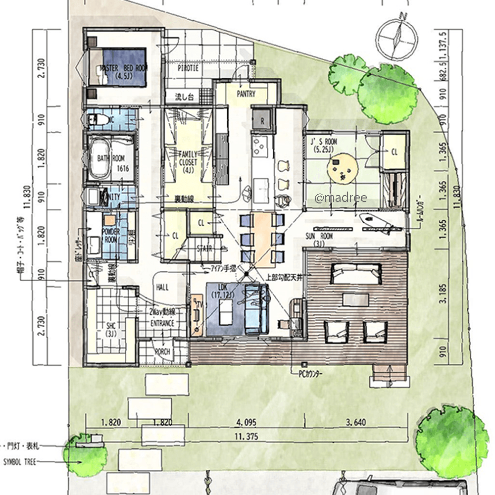 全国の建築家から間取りが集まるmadree(マドリー)で集まった40坪、5LDKの間取りです。外とつながるLDKやアウトドアリビングが特徴の注文住宅の間取りです。